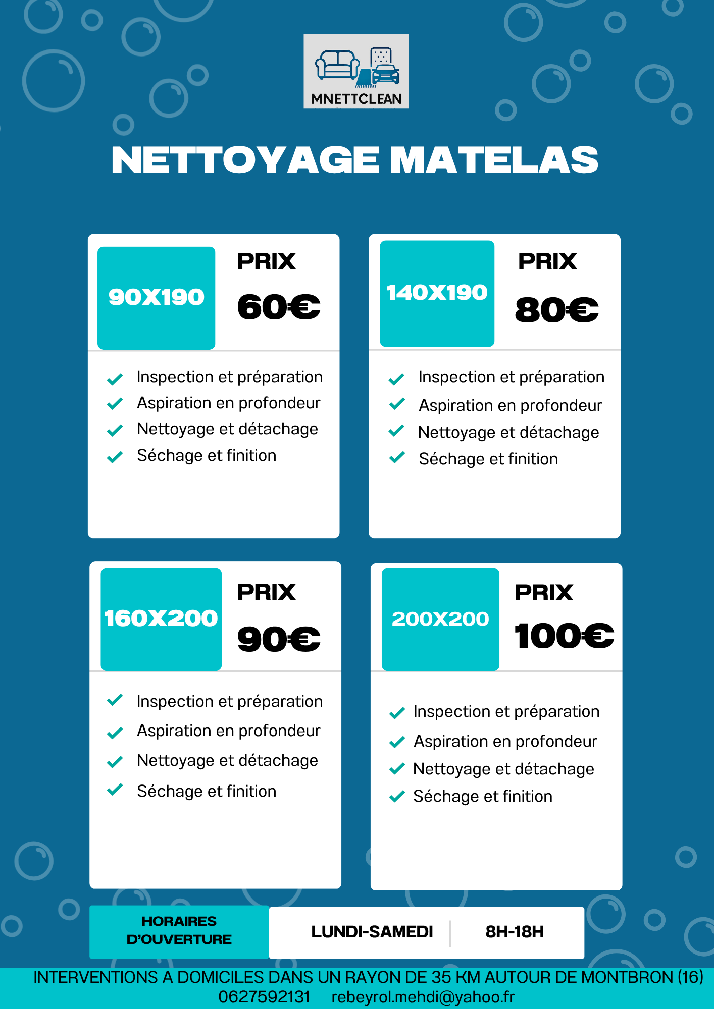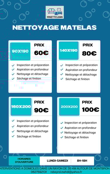 Offrez une seconde jeunesse à votre matelas grâce à notre service de nettoyage à domicile ! Nous intervenons directement chez vous pour éliminer acariens, taches, allergènes et mauvaises odeurs, sans abîmer les fibres de votre literie. Grâce à des produits et des techniques professionnelles, nous redonnons fraîcheur et hygiène à votre matelas pour un sommeil plus sain et réparateur. Idéal pour les familles, les personnes allergiques ou tout simplement soucieuses de leur bien-être.