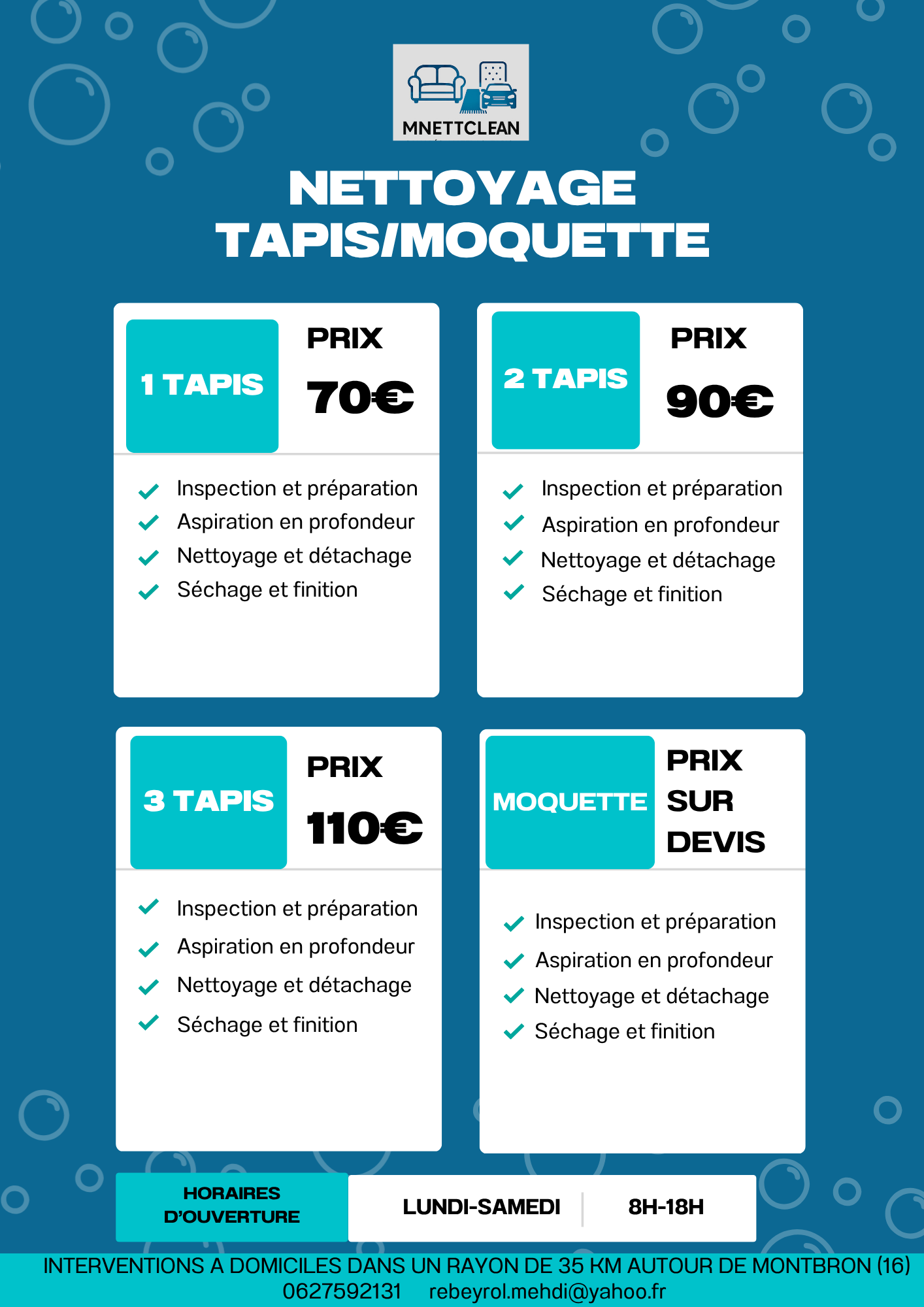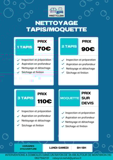 Redonnez éclat et douceur à vos tapis grâce à notre service de nettoyage à domicile ! Nous intervenons directement chez vous pour éliminer poussières, taches, acariens et mauvaises odeurs, tout en respectant les fibres et les couleurs de vos tapis. Grâce à des produits et des techniques professionnelles, nous ravivons leur beauté et prolongeons leur durée de vie. Idéal pour un intérieur plus propre, plus sain et toujours accueillant.
